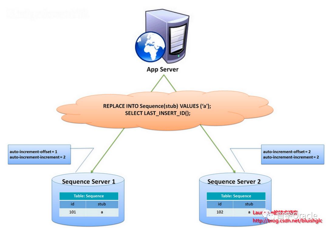 由两个数据库服务器生成ID,设置不同的auto_increment值。第一台sequence的起始值为1,每次步长增长2,另一台的sequence起始值为2,每次步长增长也是2。结果第一台生成的ID都是奇数(1, 3, 5, 7 ...),第二台生成的ID都是偶数(2, 4, 6, 8 ...)。