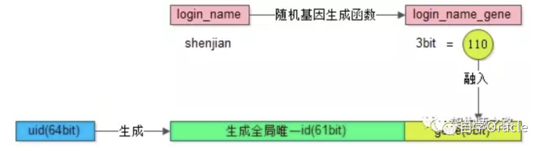 上面的映射关系的方法需要额外存储映射表,按非uid字段查询时,还需要多一次数据库或cache的访问。如果想要消除多余的存储和查询,可以通过f函数取login_name的基因作为uid的分库基因。生成uid时,参考上文所述的分布式唯一ID生成方案,再加上最后3位bit值=f(login_name)。当查询login_name时,只需计算f(login_name)%8的值,就可以定位到具体的库。不过这样需要提前做好容量规划,预估未来几年的数据量需要分多少库,要预留一定bit的分库基因。