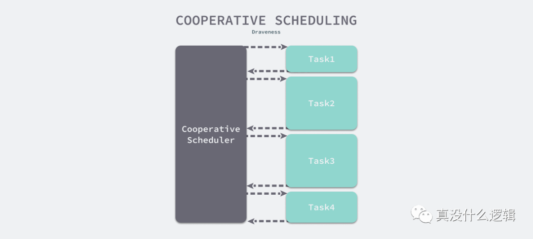 任务的执行时间和任务上下文切换的额外开销决定了哪种调度方式会带来更好的性能。如下图所示,图 7 展示了一个协作式调度器调度任务的过程,调度器一旦为某个任务分配了资源,它就会等待该任务主动释放资源,图中 4 个任务尽管执行时间不同,但是它们都会在任务执行完成后释放资源,整个过程也只需要 4 次上下文的切换。