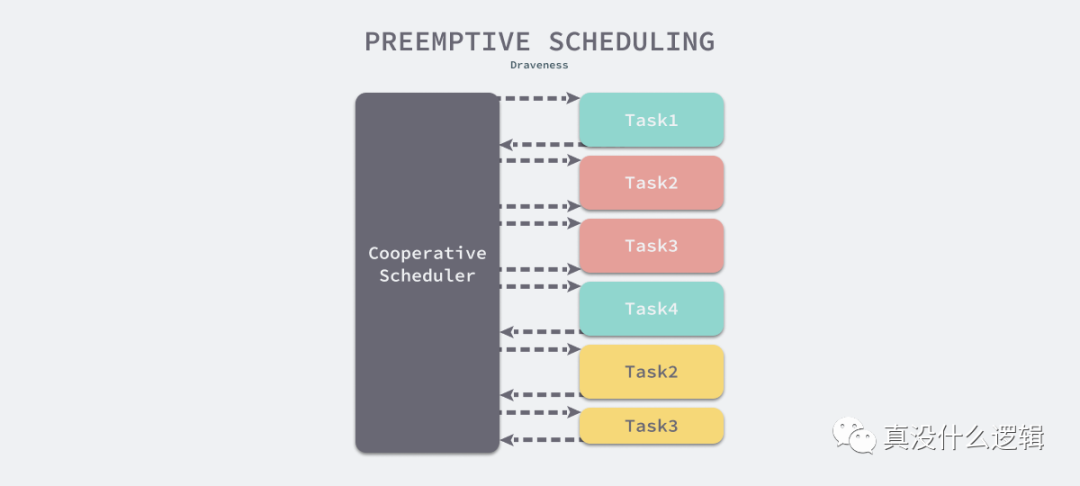 协作式调度允许任务执行任意长的时间,直到任务主动通知调度器让出资源; 抢占式调度允许任务在执行过程中被调度器挂起,调度器会重新决定下一个运行的任务;