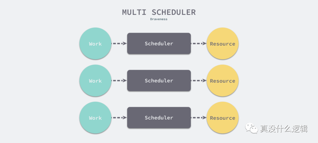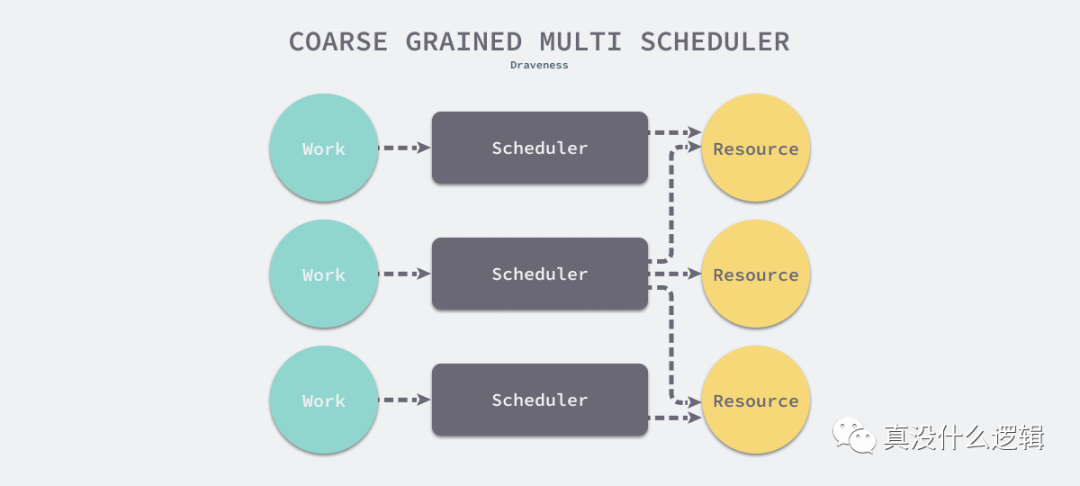 上面介绍的两种调度方法都建立在需要精准调度的前提下,多调度器中的每一个调度器都会面对无关的资源,所以对于同一个分区的资源,调度还是串行的。