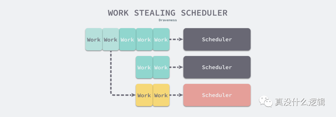 这一小节将继续介绍在多个调度器间重新分配任务的两个调度范式 — 工作分享(Work Sharing)和工作窃取(Work Stealing)[^3]。独立的调度器可以同时处理所有的任务和资源,所以它不会遇到多调度器的任务和资源的不平衡问题。在多数的调度场景中,任务的执行时间都是不确定的,假设多个调度器分别调度相同的资源,由于任务的执行时间不确定,多个调度器中等待调度的任务队列最终会发生差异 — 部分队列中包含大量任务,而另外一些队列不包含任务,这时就需要引入任务再分配策略。