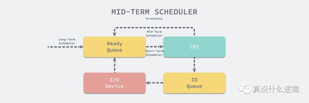 当正在运行的进程陷入 I/O 操作时,该进程只会占用计算资源,在这种情况下,中期调度器就会将它从内存中移除等待 I/O 操作完成后,该进程会重新加入就绪队列并等待短期调度器的调度。