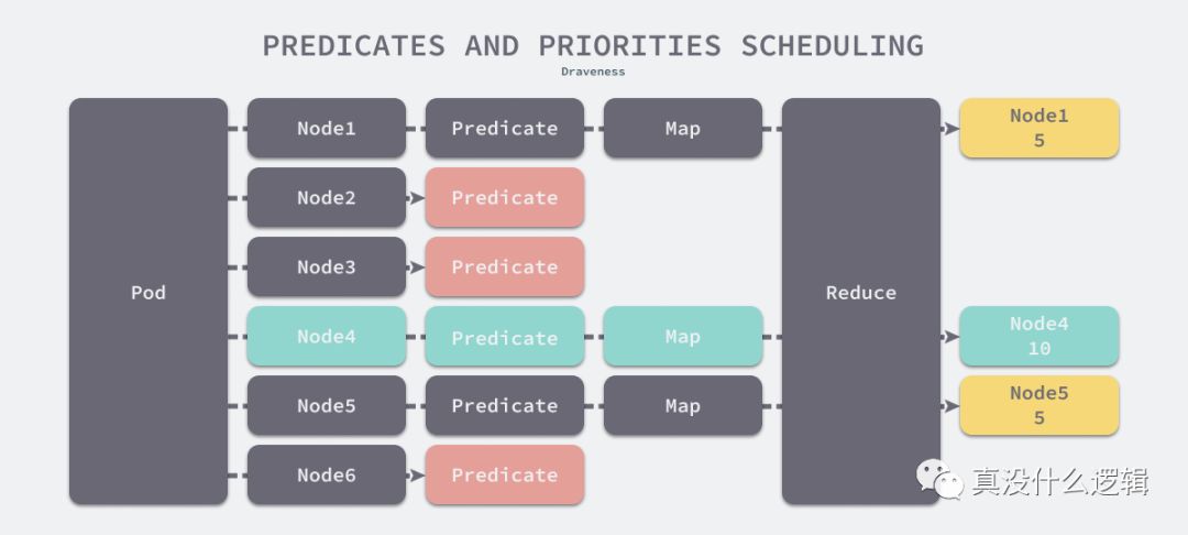 这就是使用谓词和优先级算法时的调度过程,我们在这里省略了调度器的优先队列中的排序,出现调度错误时的抢占以及 Pod 持久存储卷绑定到 Node 上的过程,只保留了核心的调度逻辑。
