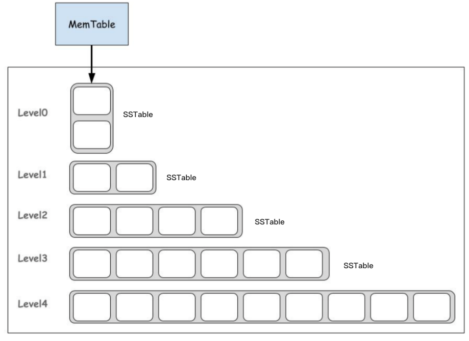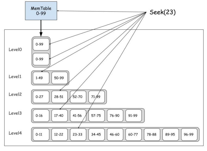按照图中标示的顺序,会先读取内存,在从Level0依次往高层读取,直到找到key=23的数据。 范围读 :是指读取一个范围内的数据,如读取[23-40]内的所有数据( select * from t where key >= 23 && key <=40),则需要做的是在每一层SSTable找到这个范围内的第一个block,然后遍历block块的数据,直到不符合范围条件。 参考资料【4】 “ ReadOnly MemTable :如RocksDB,在MemTable 和 Level0数据之间还有一个内存的ReadOnly MemTable结构。它是LSM Tree在内存中还未刷盘的写入数据,这里面的数据不可以修改。是当MemTable到达一定量需要刷到SSTable时,由MemTable完整copy下来的。这样可避免从MemTable直接刷到SSTable时的并发竞争问题。