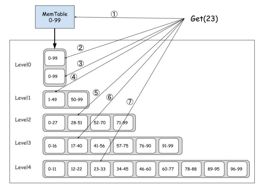 MemTable :是LSM Tree在内存中还未刷盘的写入数据,这里面的数据可以修改。是一个有序的树状结构,如RocksDB中的跳表。SSTable(Sorted String Table) :是一个键是有序的,存储字符串形式键值对的磁盘文件。当SSTable太大时,可以将其划分为多个block;我们需要通过 下图中的Index 记录下来每个block的起始位置,那么就可以构建每个SSTable的稀疏索引。这样在读SSTable前,通过Index结构就知道要读取的数据块磁盘位置了。LSM Tree读数据 读数据 包括点读和范围读,我们分开讨论。假设LSM Tree中的key为[0-99], 点读 :是指准确地取出一条数据,如get(23),则其示意图为: