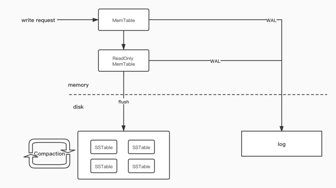 LSM Tree写数据 在LSM Tree写入数据时,我们把ReadOnly MemTable画上,示意图如下: