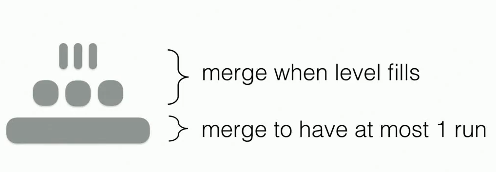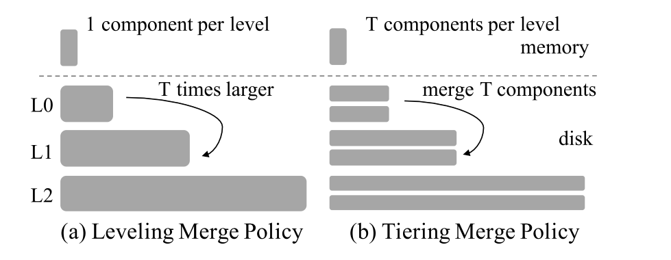 当有写请求时,数据会先写入MemTable,同时写入 WAL Log;当MemTable空间不足时,触发ReadOnly MemTable copy,同时写入WAL Log;然后刷新到磁盘Level0的SSTable中。当低层SSTable空间不足时,不断通过Compaction和高层SSTable进行Merge。 LSM Tree合并策略 LSM Tree有两种合并策略,Tiering 和 Leveling。我们看图说话: