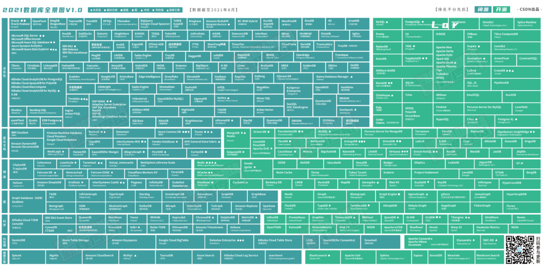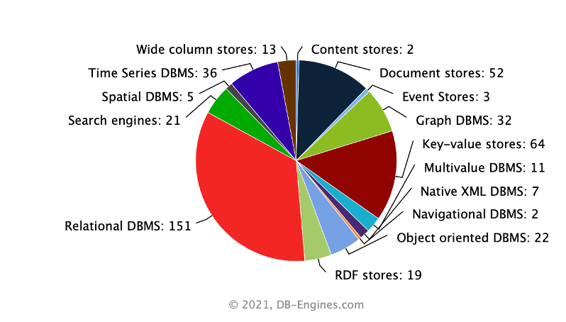 虽然数据库种类越来越多,但整体来看,还是关系型数据库为主导。在DBengine显示的378个数据库中(统计时间是2021年9月份),有151个数据库均是关系型数据库。