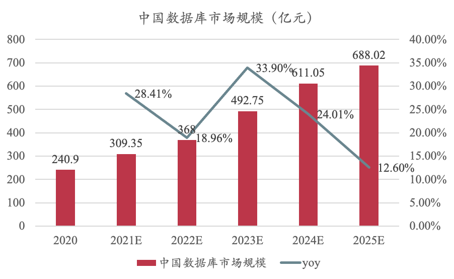 从市场规模来看,根据中国信息通信研究院发布的《2021年度数据库发展研究报告》指出,2020年我国数据库的市场规模达到了240.9亿人民币,未来5年将会保持23.35%的年复合增长率, 并且在2025年来到688亿美元,是目前国内基础软件领域增速较高的细分市场。