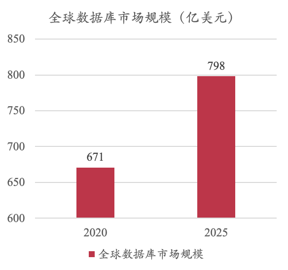 从全球的数据库发展来看,2020年全球的数据库市场规模是671亿美元,到2025年将会达到798亿美元,年复合增速达到3.5%。
