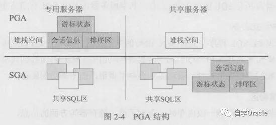 用户进程连接到Oracle数据库后,服务器创建会话,同时分配一个PGA区。一个PGA区由一个Oracle用户进程所使用,不能共享。对专用服务器(一个数据库连接对应一个专用服务器进程),PGA保存堆栈空间信息和会话信息、游标状态、排序区保存在SGA中。