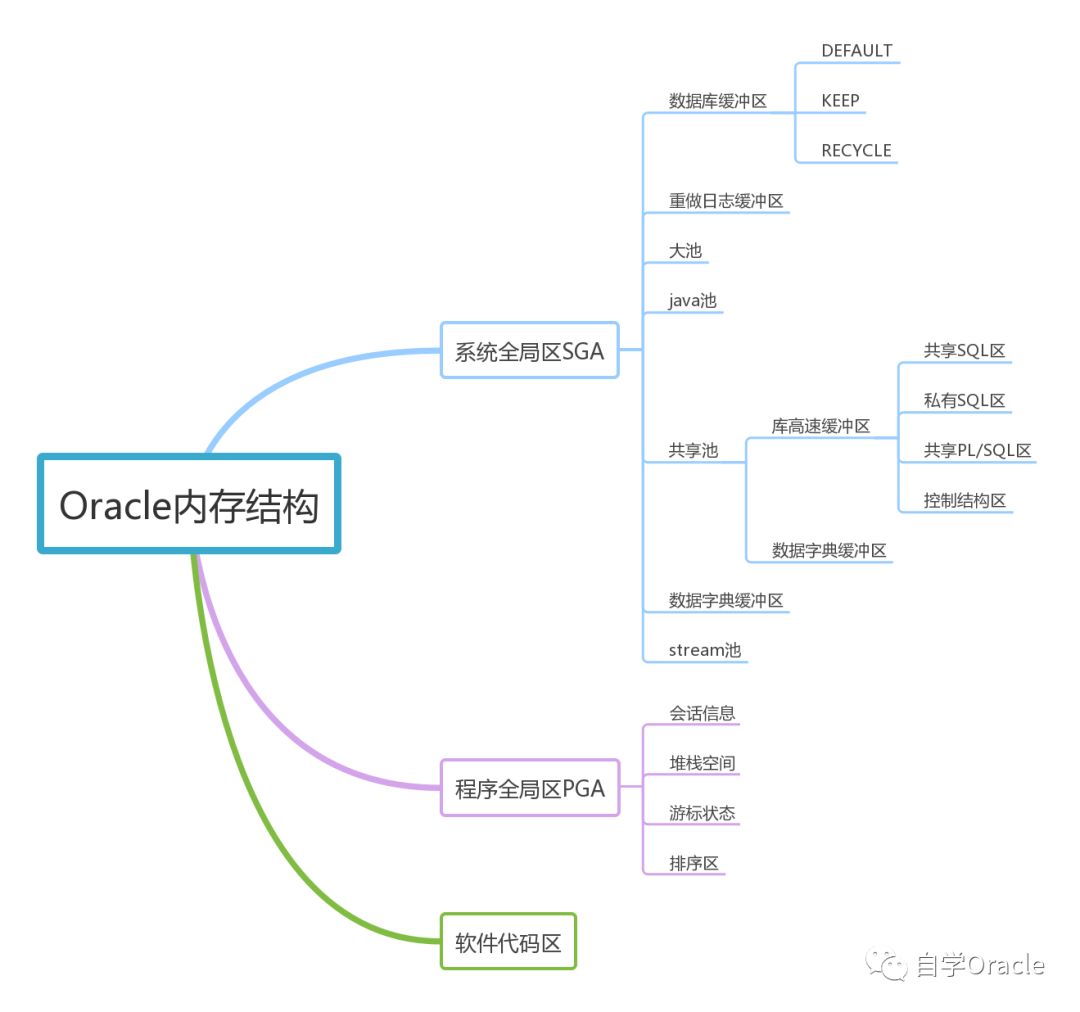 Oracle内存存储了数据字典信息、缓冲的应用数据、sql语言、PL\SQL和java程序数据,以及事务、控制、用户请求信息。