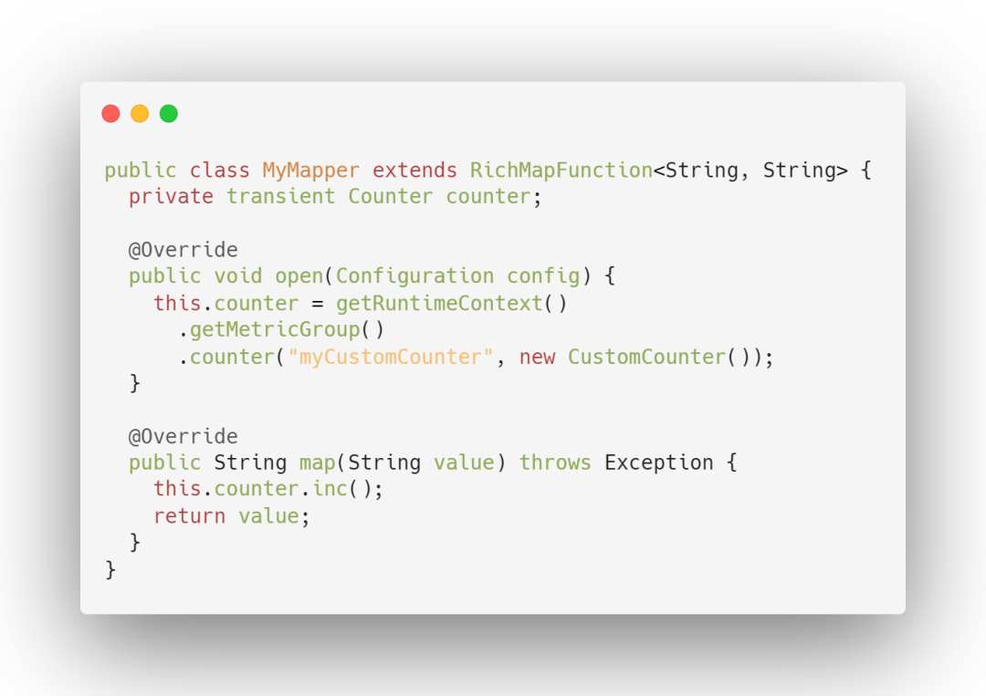 使用方式:可以通过调用 counter(String name)来创建和注册 MetricGroup