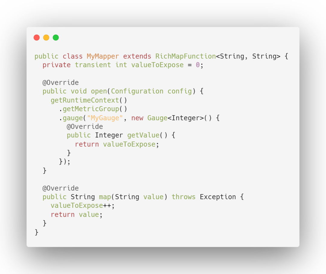 使用前首先创建一个实现 org.apache.flink.metrics.Gauge 接口的类。返回值的类型没有限制。您可以通过在 MetricGroup 上调用 gauge