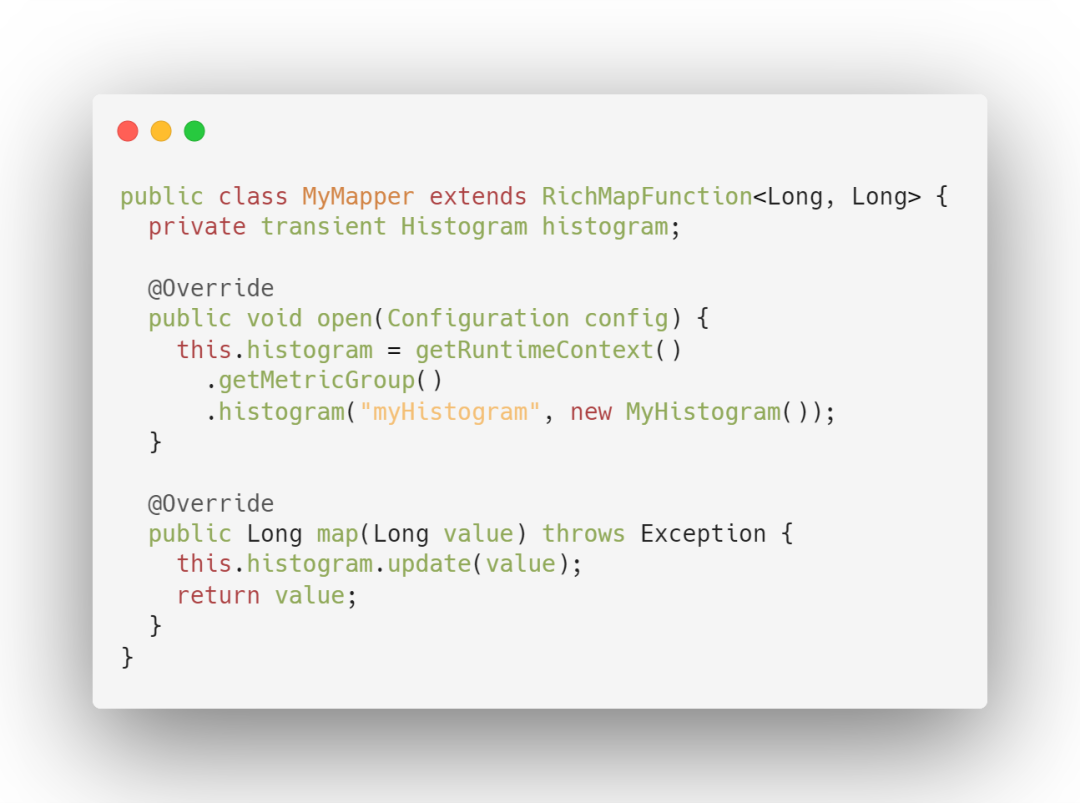 Histogram 用于统计一些数据的分布,比如说 Quantile、Mean、StdDev、Max、Min 等,其中最重要一个是统计算子的延迟。此项指标会记录数据处理的延迟信息,对任务监控起到很重要的作用。