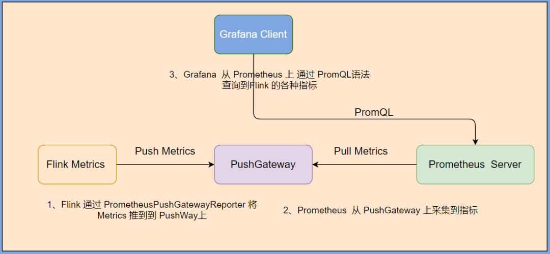 当 用户 使用 Flink 通过 session 模式向 yarn 集群提交一个 job 后,Flink 会通过 PrometheusPushGatewayReporter 将 metrics push 到 pushgateway 的 9091 端口上,然后使用外部系统 prometheus 从 pushgateway 进行 pull 操作,将指标采集过来,通过 Grafana可视化工具展示出来。原理图如下:
