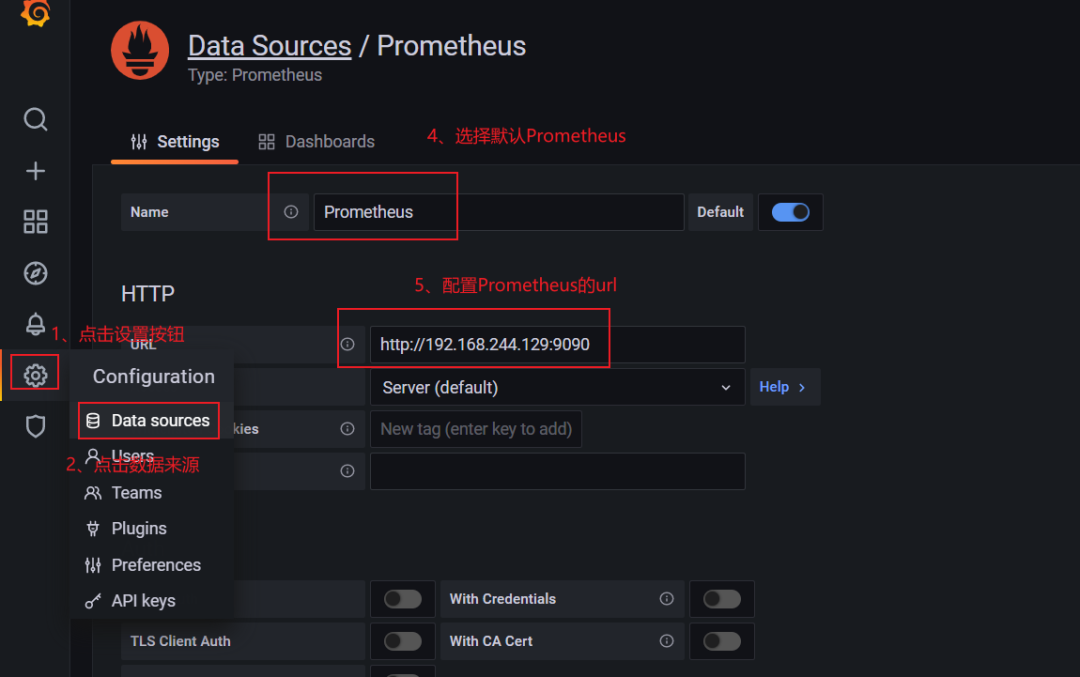要访问 Prometheus 设置,请将鼠标悬停在配置(齿轮)图标上,然后单击数据源,然后单击 Prometheus 数据源,根据下图进行操作。