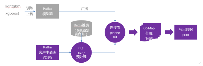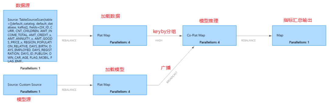 Flink Source 从 data kafka topic 中读取推理数据,通过 sql 预处理成模型推理要求的数据格式,在进行 keyBy 分组后流入下游 connect 算子,与模型 connect 后进入 Co-FlatMap 算子再进行推理,原理图如下:
