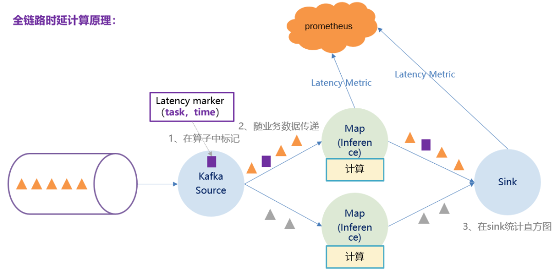 全链路时延要使用 latency metric 计算。latency metric 是由 source 算子根据当前本地时间生成的一个 marker ,并不参与各个算子的逻辑计算,仅仅跟着数据往下游算子流动,每到达一个算子则算出当前本地时间戳并与 source 生成的时间戳相减,得到 source 算子到当前算子的耗时,当到达 sink 算子或者说最后一个算子时,算出当前本地时间戳与 source 算子生成的时间戳相减,即得到全链路时延。原理图如下: