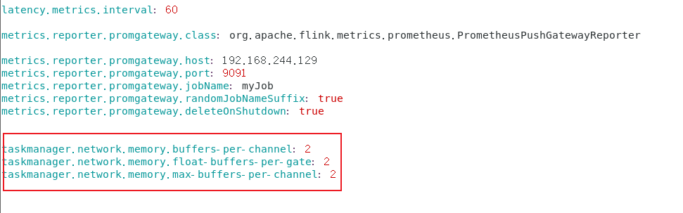 选取 PrometheusPushGatewayReporter 方式,通过在官网查询 Flink 1.13.2 Metrics 的配置后,在 flink-conf.yaml 设置,配置如下: