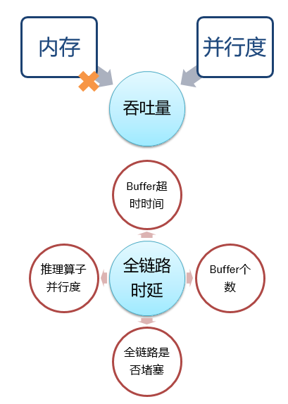 Buffer 超时越短、个数越少、时延越低。 整个链路是否有算子堵塞(车道排队模型)。 调大推理算子并行度,时延降低,吞吐升高(即增加了推理的处理能力)。