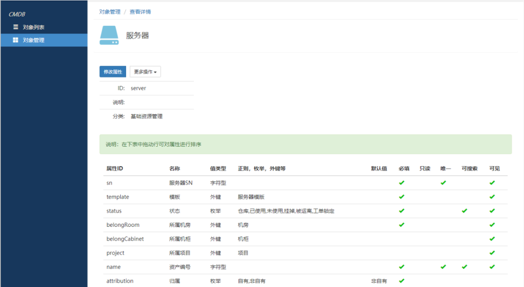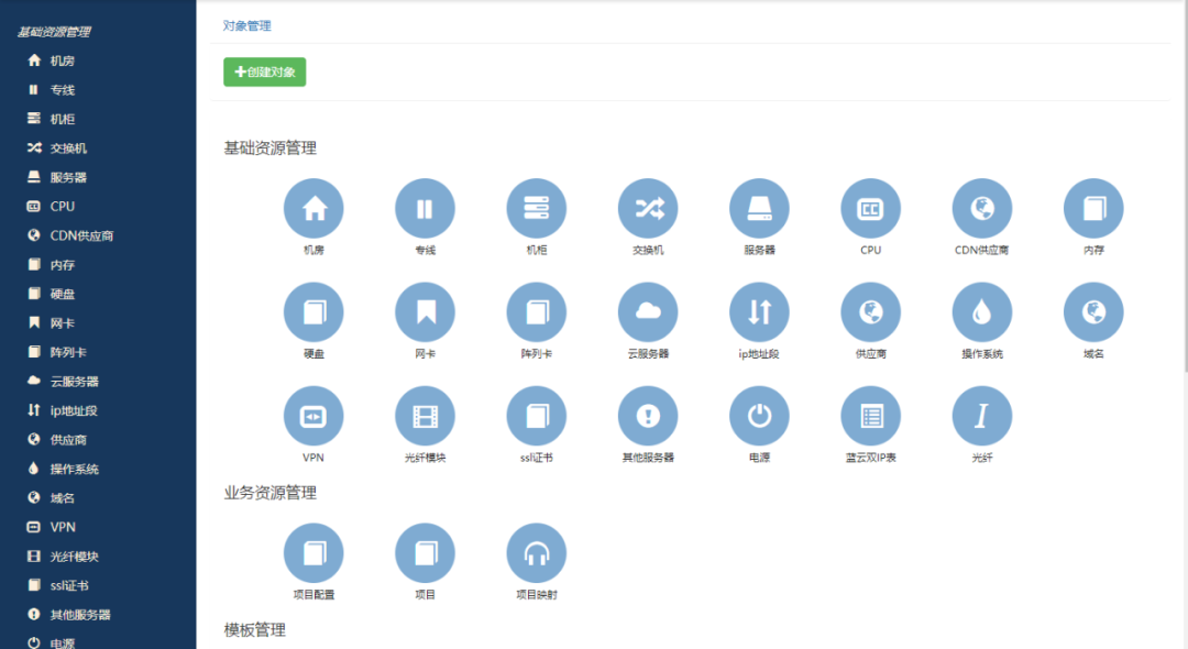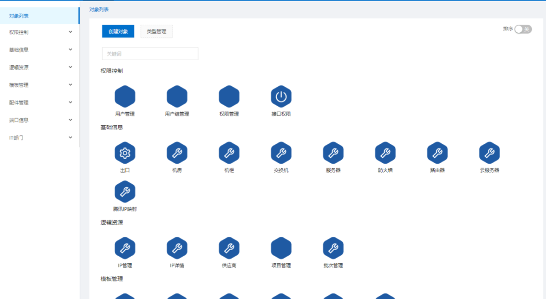 小叶:我给你演示下我们现在的CMDB,首先是对象管理页面,能够创建对象,所有的资源都可以是一个对象,比如机房、机柜、交换机、服务器、cpu等等,都可以是一个对象。