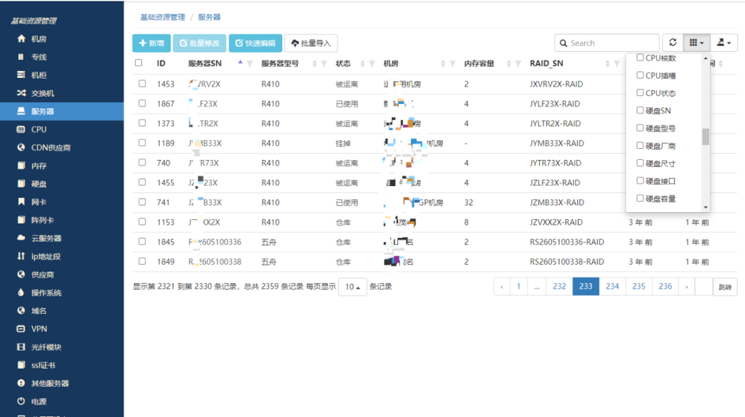 对象之间的关联关系,我们用外键表示。比如服务器和机房、服务器和机柜、服务器和项目,都是通过服务器这个对象上添加外键字段来表示。表和字段添加好了,接下来是表数据。服务器的各种配置都是在这里调整,映射到数据库就是数据的update,变更历史都是可追溯的。