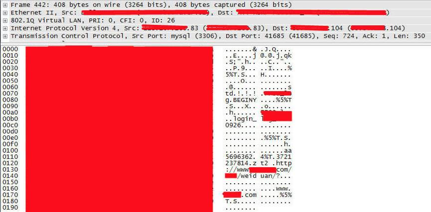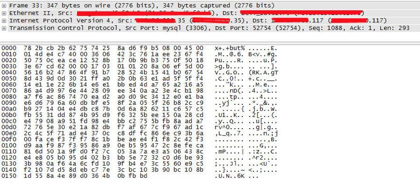 xxx.xxx.xxx.83配置了MySQL主库,另外的一台外网机器xxx.xxx.xxx.104配置了MySQL从库。并且该主从并未配置SSL加密。测试中利用xxx.xxx.xxx.109成功监听到MySQL主从的通信。
