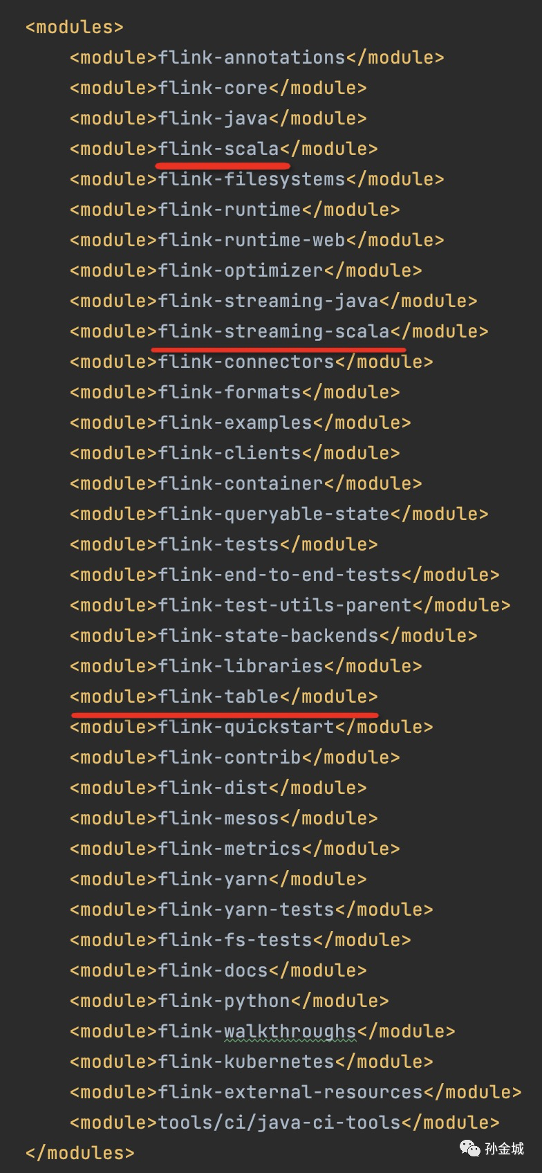 从Flink所有的Module看,只有 flink-scala/flink-stream-scala/flink-table模块涉及到了scala的依赖,flink-scala是基础封装,包括 type,codegen,metric等基础部分,而flink-stream-scala是纯面向Scala用户的DataStream API部分,flink-talbe是里面有scala部分的SQL层面封装。多说一句,不仅仅是Java/Scala的用户受众,Flink更期望对多语言有很好的支持,PyFlink就迈出了Flink 多语言支持的第一步~~ :)