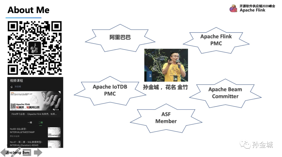 首先,还是简单的自我介绍一下,我是孙金城,花名 金竹,来自阿里巴巴,从2016年开始一直投入在开源建设中,目前是Apache Flink PMC成员,Apache Beam Committer和Apache IoTDB的PMC成员。同时也是Apache 软件基金会的成员,Apache Member。平时也喜欢写一些技术类博客和录制一下视频课程,也欢迎大家关注我的公众号。