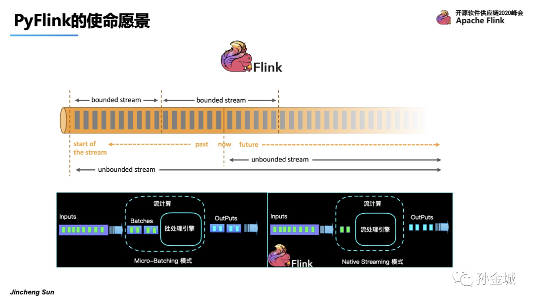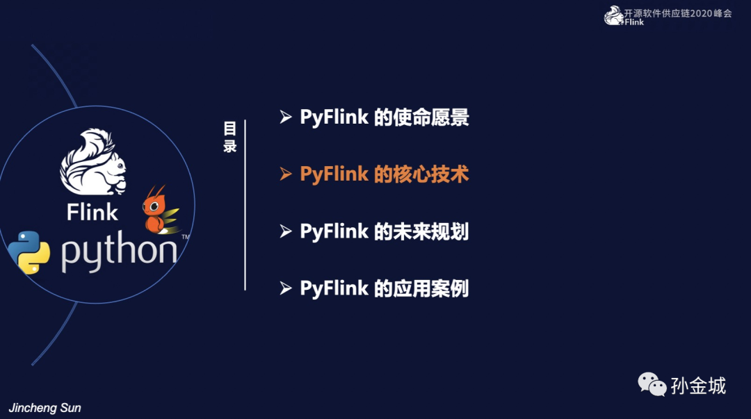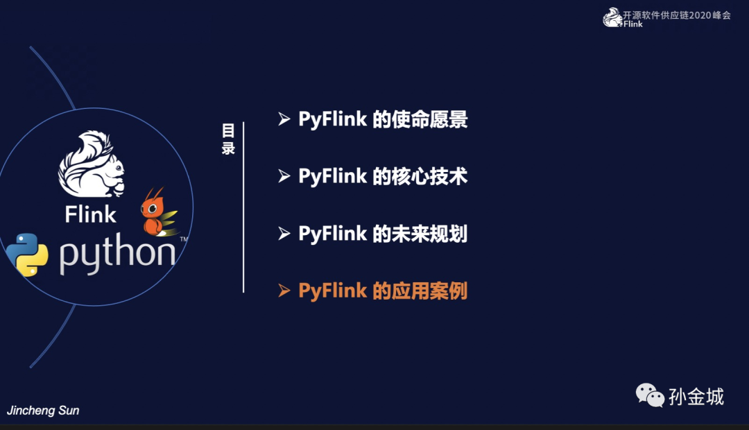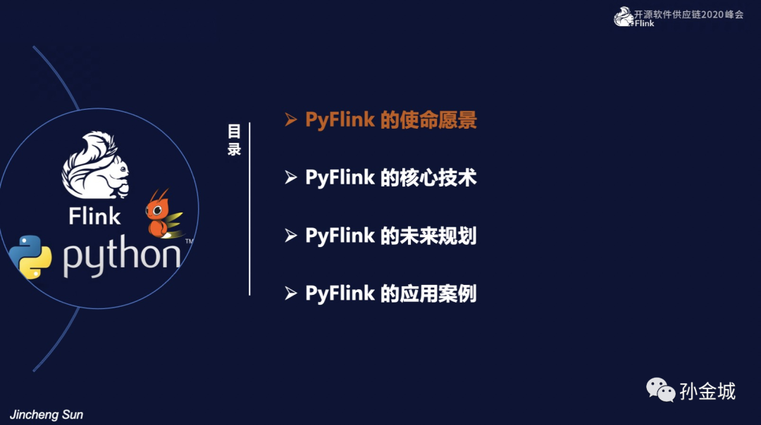 今天我们有4个部分的内容分享,首先我们快速了解一下PyFlink的使命愿景,然后重点介绍PyFlink的核心技术点,最后是和大家快速介绍PyFlink的未来规划和现有的应用案例。那么我们开始今天的第一部分,PyFlink的使命愿景。