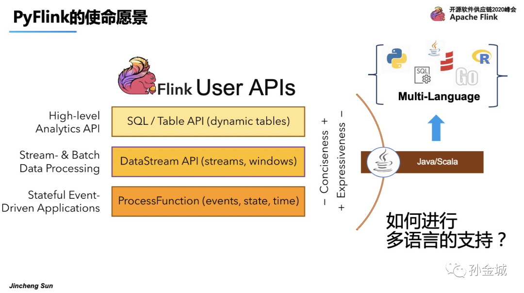 那么,如果将Flink的能力进行放大,面向更多的用户群体将是一件非常有意义的事情,那么如何在在Flink上进行多语言的支持呢?增加哪些语言的支持呢?
