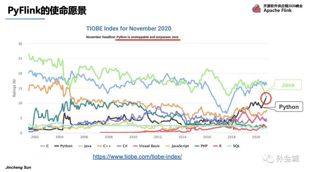 我们在进行PyFlink的工作之前进行了一些调研,我们发现Python语言在2020年的活跃程度超过了Java语言,并且是一个持续上升的趋势。