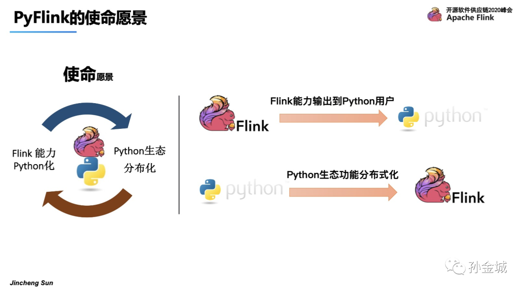 所以,面对Flink能力需要面向更多的用户群体,Python又是最受欢迎的语言,Python就成为了Flink多语言支持的第一个语言。同时面对Python语言的分布式能力的匮乏,PyFlink的使命也是要将Python生态具备分布处理能力。所以,Pyflink的使命就是Flink能力输出到Python用户,并令Python生态具备分布式化能力。