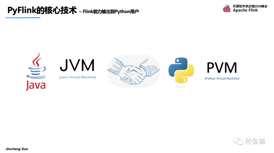 首先,Flink能力输出到Python用户最核心问题显而易见是Python VM和Java VM的握手,他们之间要建立通讯,这是PyFlink首要解决的问题。