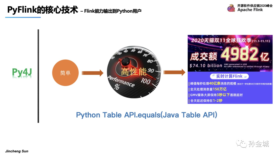 那么基于这样的架构有怎样的优势呢?第一个就是简单,并确保Python API语义和Java API的一致性,第二点,Python 作业可以达到和Java一样的极致性能,在刚刚结束的阿里双11狂欢节中,创造了峰值40亿的处理能力。
