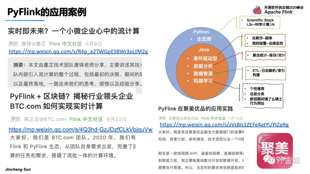 比如,比特币大陆,聚美优品等等。目前PyFlink已经趋于成熟,非常适合大家选择Flink快速构建分布式计算系统的切入开发语言。