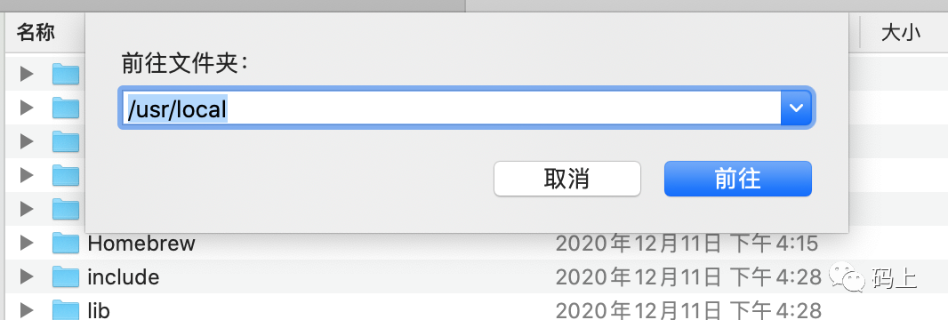 默认情况下在Finder中是看不到 usr 这个目录,可以打开Finder后按 shift + command +G 输入 usr/local 后回车(也可以点击顶部菜单中“前往”--“前往文件夹”选项)便能看到这个目录了。