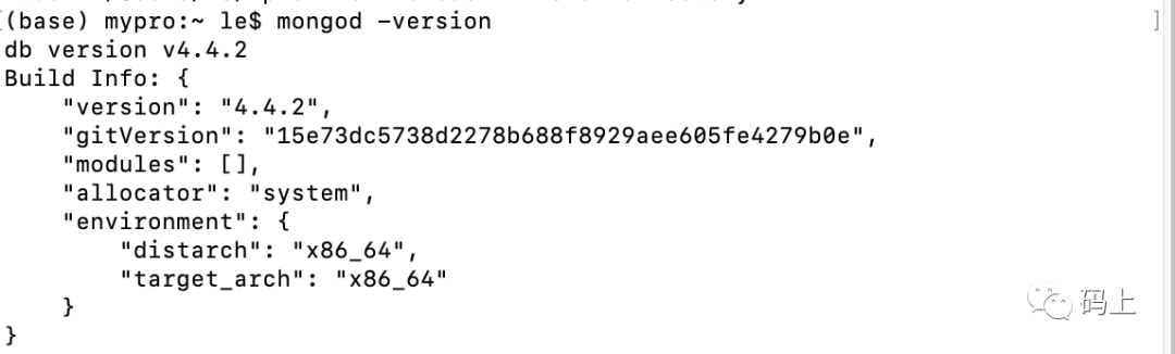 回车后如果看到下面的版本号则说明MongoDB已经成功安装到了Mac上。