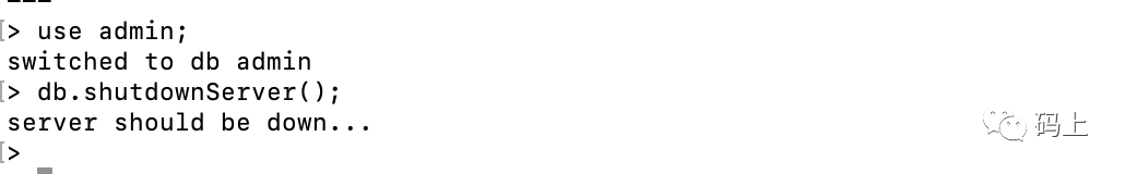 要停止 MongoDB 的时候一定要正确的退出,不然下次再次连接数据库会出现问题,使用下面的两行代码可以完成这一操作:
