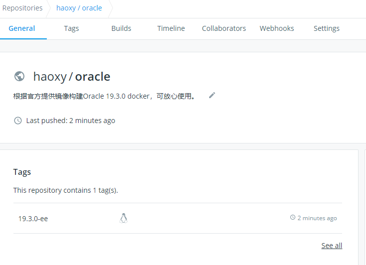 [root@host01 oracle19c]# docker tag 1caec1c121df haoxy/oracle:19.3.0-ee[root@host01 oracle19c]# docker imagesREPOSITORY TAG IMAGE ID CREATED SIZEoracle/database 19.3.0-ee 1caec1c121df 8 minutes ago 6.65GBhaoxy/oracle 19.3.0-ee 1caec1c121df 8 minutes ago 6.65GBoraclelinux 7-slim 874477adb545 3 months ago 118MB