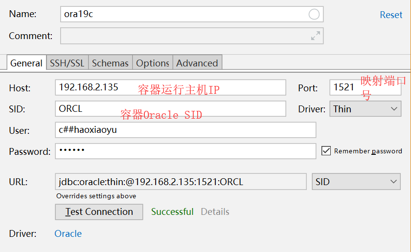 使用 本地的 IP 地址,映射的端口号,容器内 Oracle SID 进行连接。