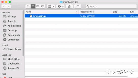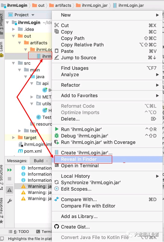 先定位到jar包,对ihrmLogin.jar单击右键,选择在Finder中打开(Windows 操作系统有略微区别,但是意思差不多)