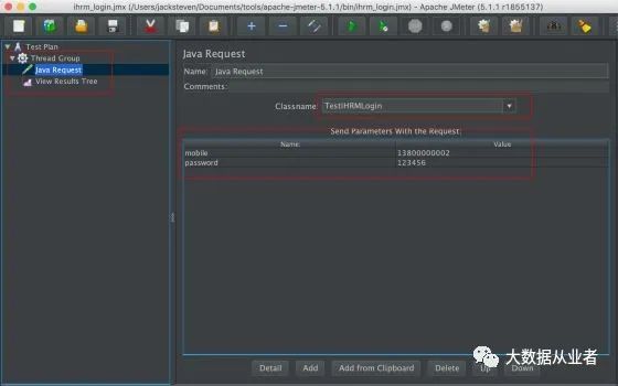 设置Java请求,在Classname中选择我们编写的TestIHRMLogin请求,填入mobile:13800000002,password:123456