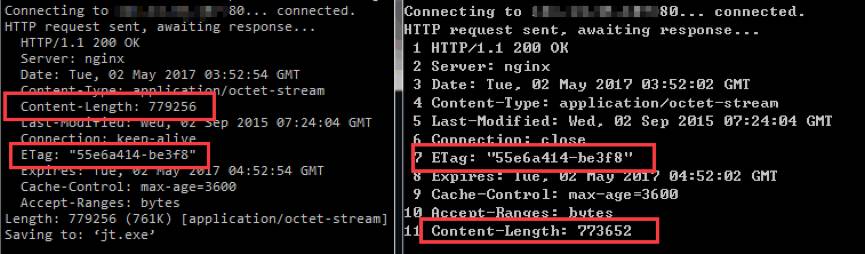 注意,这里用户端下载的时候,获取到的http头部除了Content-Length会变为新的长度值之外,别的头部都不会变,比如我们的APK下载里面的md5值和etag值等,虽然头部校验是含有我们正确的头部,但是内容还是可能会变为别的。