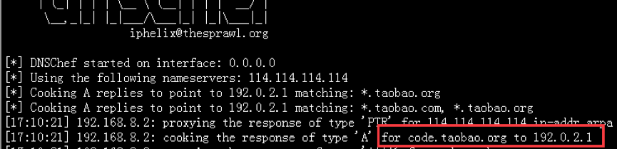 dnschef --nameservers=114.114.114.114 --fakeip=192.0.2.1 --fakedomains=*.taobao.org,*.taobao.com -i 0.0.0.0