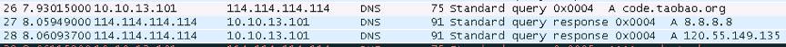 抓包可以看到这个伪造的结果比正常的dns返回先返回给了用户,这样就达到了欺骗效果:
