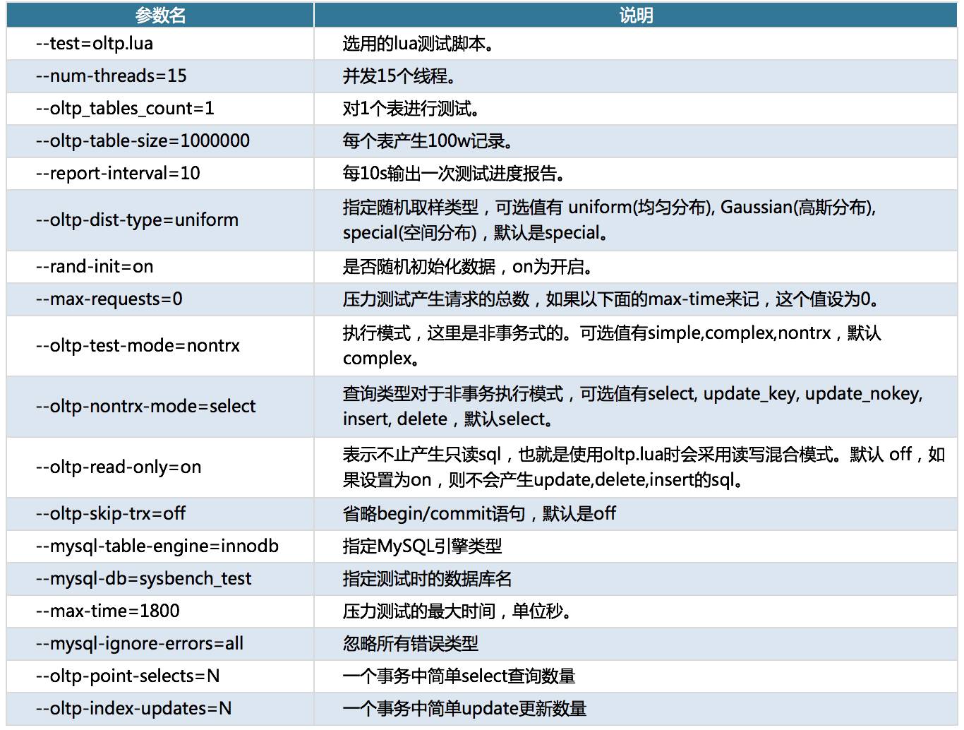 为了更好地理解后面的测试过程,我们先对sysbench和ycsb的使用参数进行详细说明。