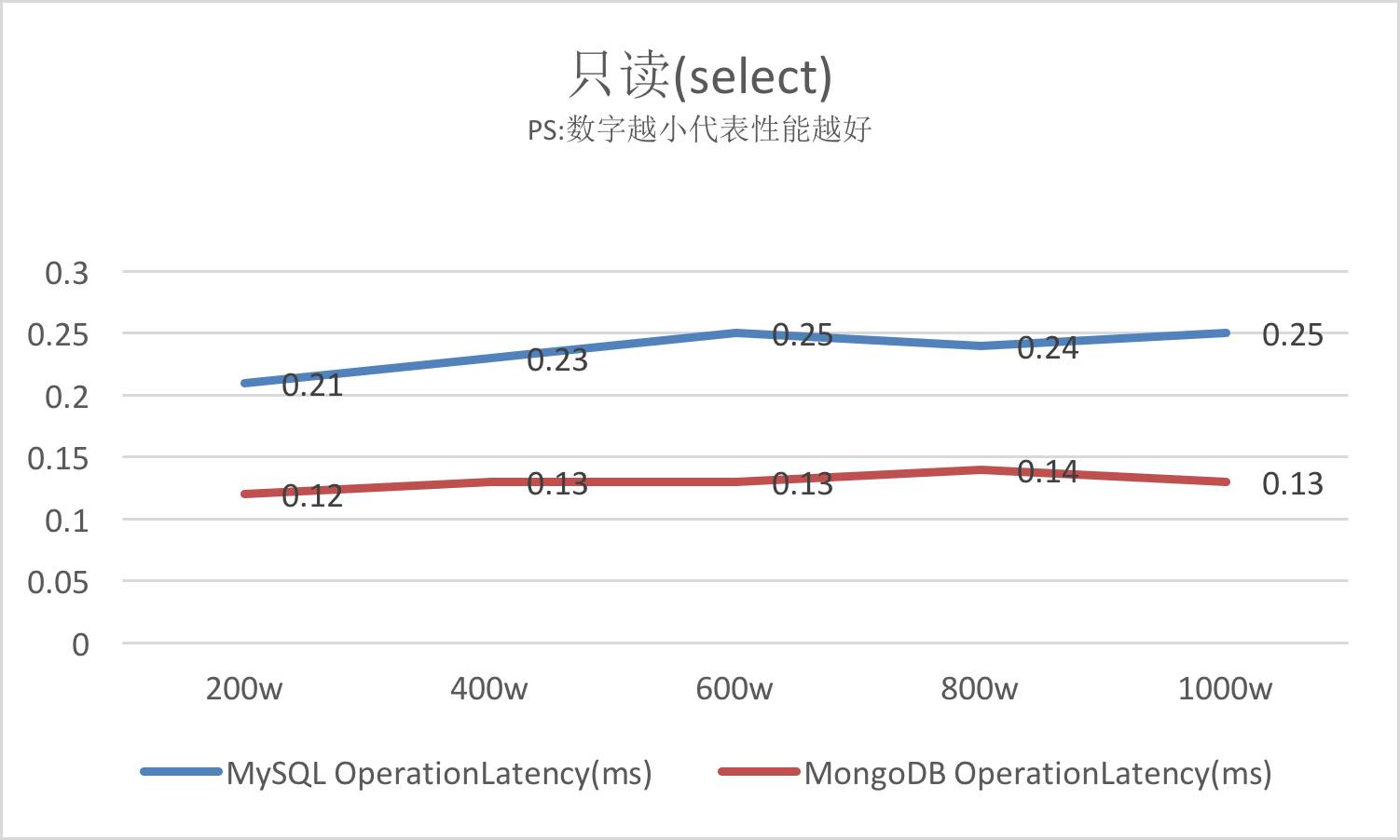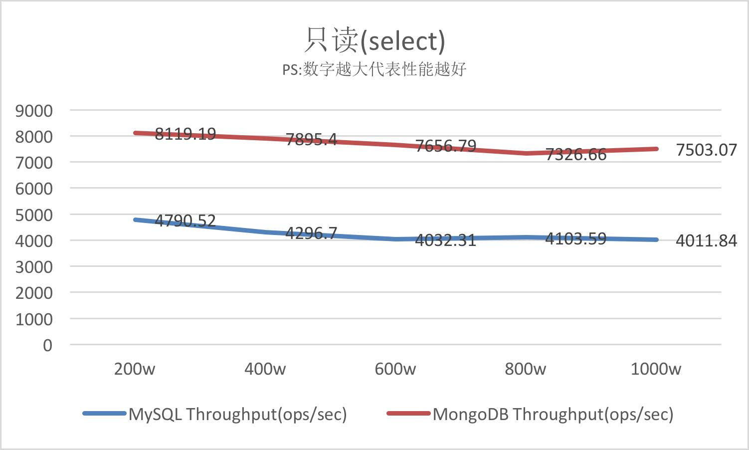 PS:MongoDB在读取的场景有着天生的优势,每秒的Select操作数远远超越MySQL。
